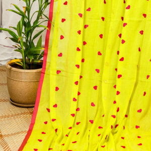 Elevate your ethnic wardrobe with a burst of sunshine. This contemporary Bengali cotton saree combines traditional handloom techniques with a playful, modern aesthetic. Crafted from lightweight, breathable cotton, it features a striking neon yellow body adorned with delicate pink heart-shaped buttis (motifs) distributed across the fabric.