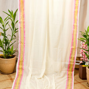 The highlight of this piece is its striking dual-tone border in vibrant shades of fuchsia pink and sun-kissed golden yellow, finished with charming handmade pink tassels (latkans) along the pallu. Whether you’re heading to a brunch, a creative workspace, or a casual festive gathering, this saree offers a minimalist yet sophisticated look.