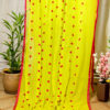 The highlight of this piece is its striking dual-tone border in vibrant shades of fuchsia pink and sun-kissed golden yellow, finished with charming handmade pink tassels (latkans) along the pallu. Whether you’re heading to a brunch, a creative workspace, or a casual festive gathering, this saree offers a minimalist yet sophisticated look.